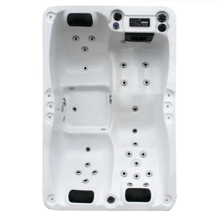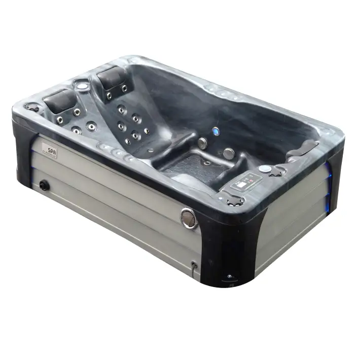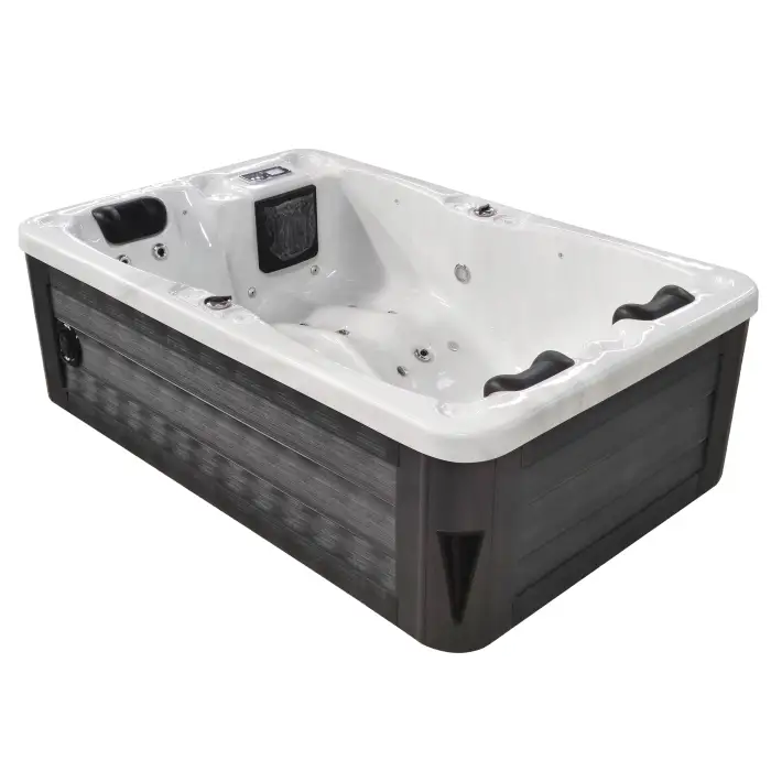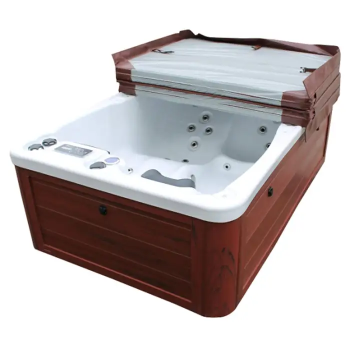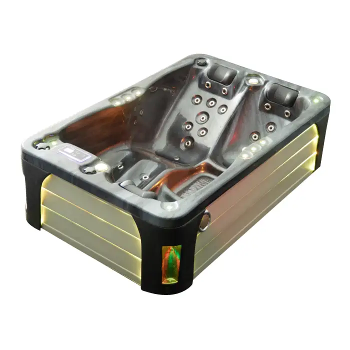The hot tub features custom whirlpool jets for a relaxing experience.