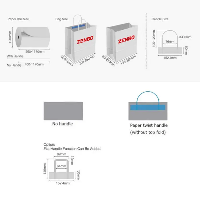 The Machinery for the Production of Paper Bags is designed primarily for creating shopping bags, with a maximum bag width ranging from 200 to 360 mm.