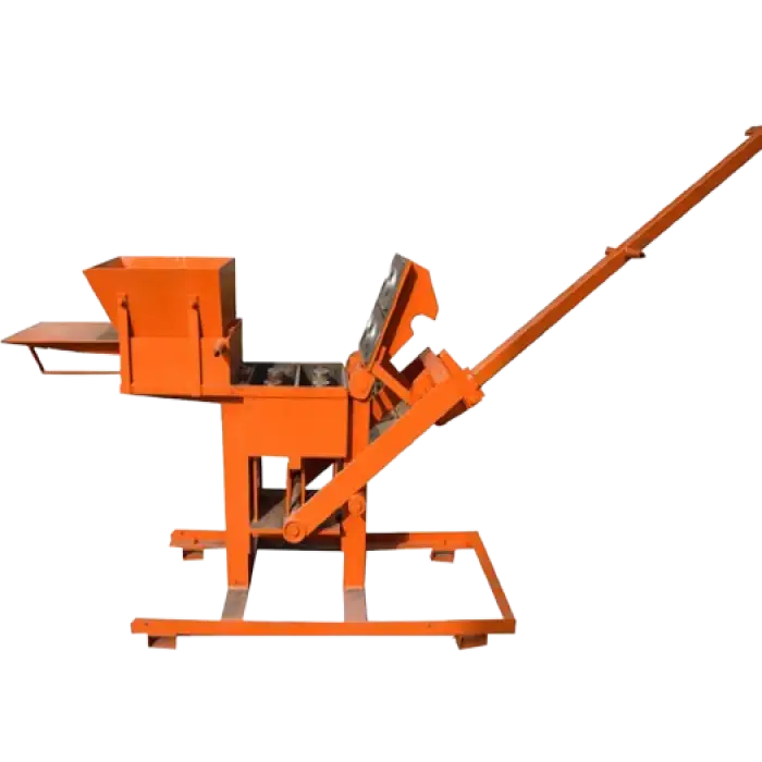 A hand-operated machine that produces interlocking clay/earth blocks without baking. It compresses raw clay soil into durable, interlocking blocks using interchangeable moulds and a manual mechanism.