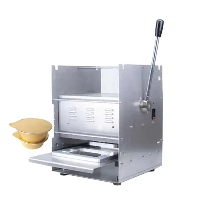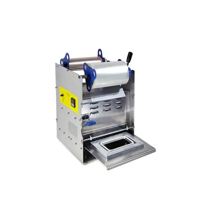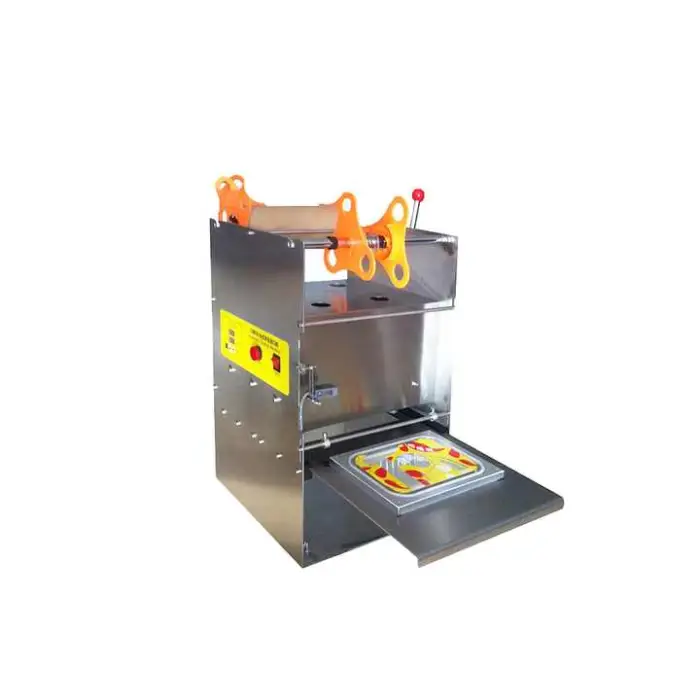 This is a manual semi-automatic sealing machine for disposable food containers. It seals plastic and aluminum-foil lids to fast food boxes, containers and similar packaging to create airtight, tamper-evident seals.