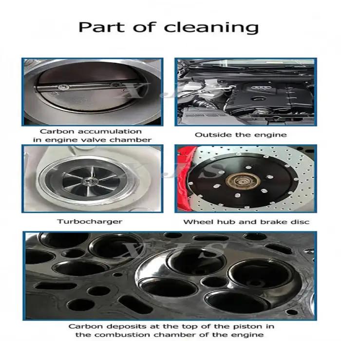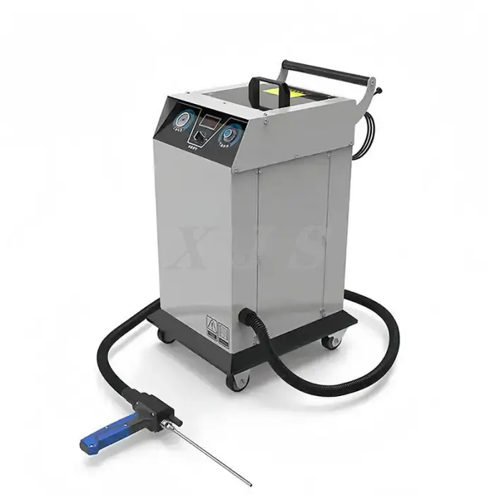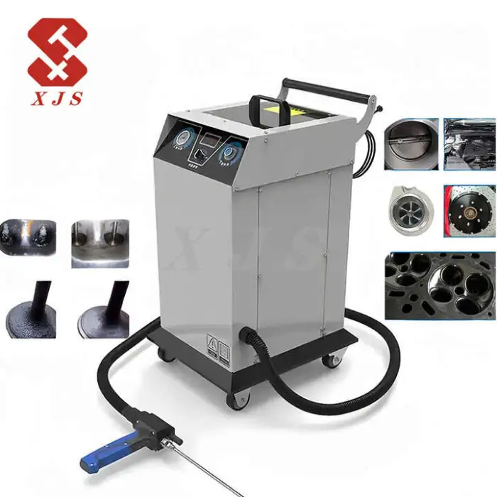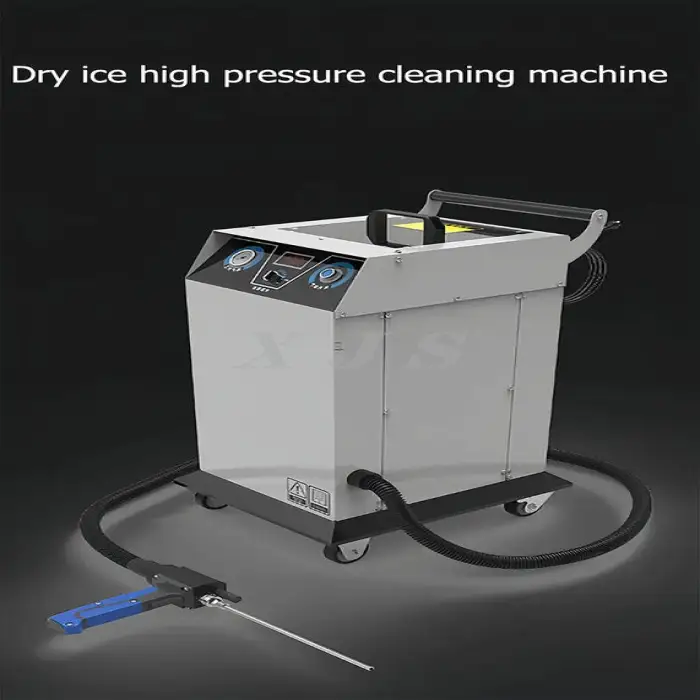 This machine performs high pressure cleaning using dry ice, which is effective for various applications, including descaling and stripping.