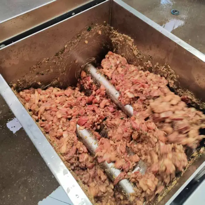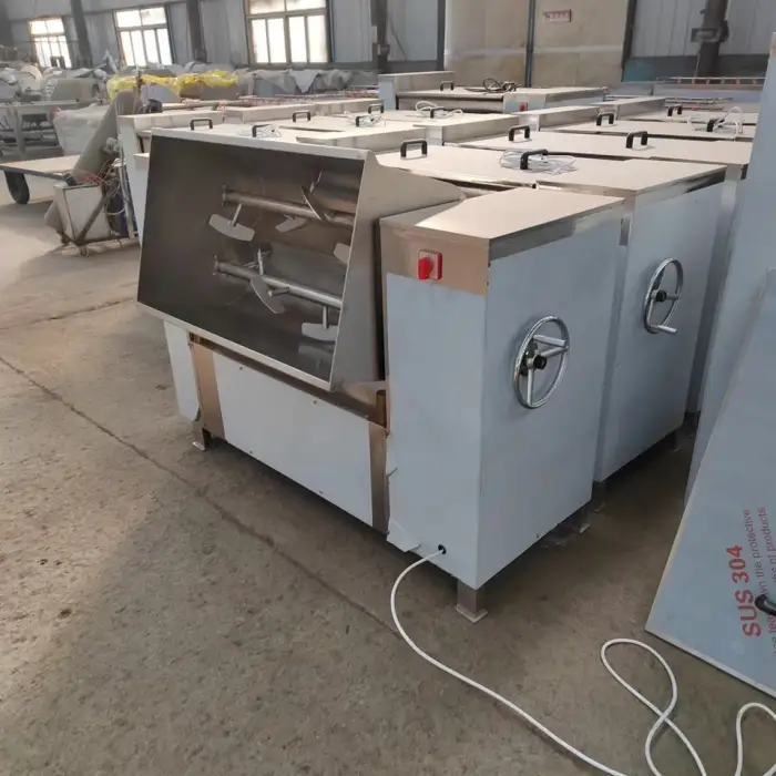 The mixing time can vary based on the quantity and type of meat, but the machine is designed for high efficiency, significantly reducing mixing time compared to manual methods.