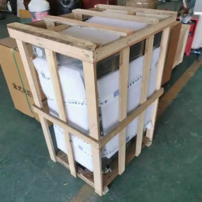 The Meat Slicer is securely packed in a wooden case for safe shipping and handling.