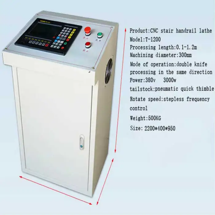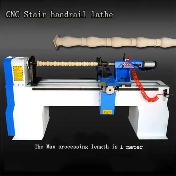 Yes — it is specifically designed for cylindrical wood turning and is well suited for stair handrails, balusters and similar profiles. The 300 mm swing diameter and up to 1100–1200 mm turning length accommodate most handrail and baluster work.