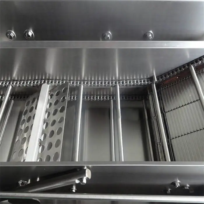 The machine can be powered by either gas or electric heat sources, providing versatility for different kitchen setups.