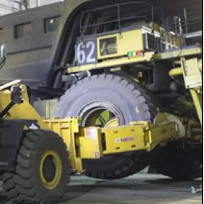 Its robust and powerful design allows it to efficiently manage and move large mining truck tires with ease.