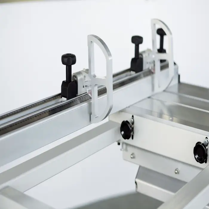 The sliding table is made from high-strength extruded aluminium alloy for rigidity and smooth movement. Its dimensions are 3200 mm × 415 mm, suitable for large panel handling.