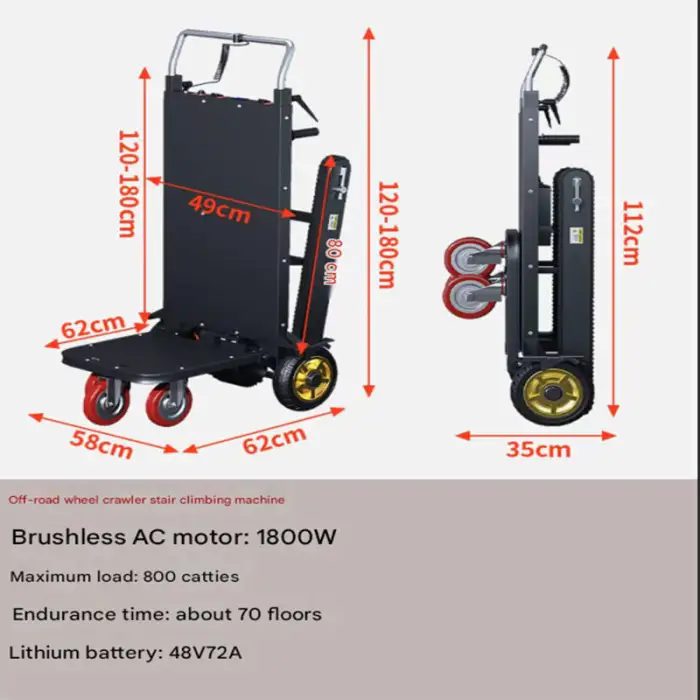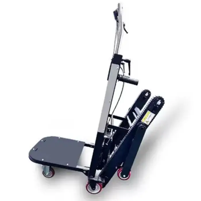 The trolley includes safety mechanisms to prevent tipping and ensure stable operation while climbing stairs.