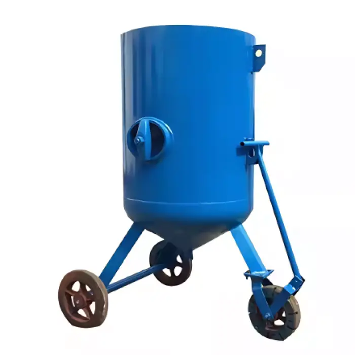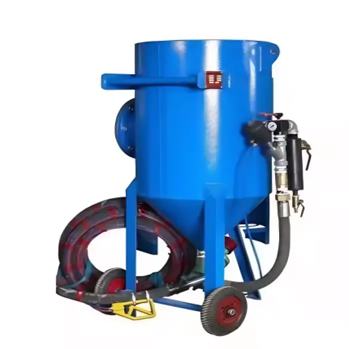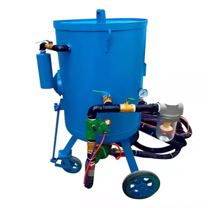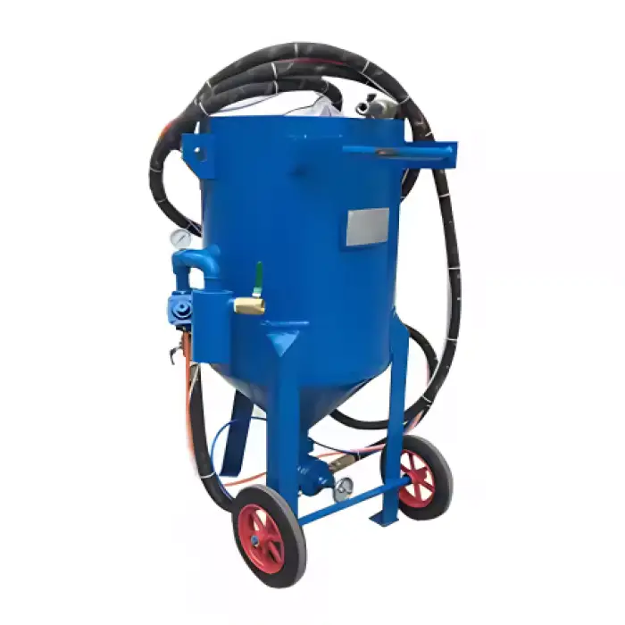 The machine uses high-pressure air to propel abrasive materials onto the surface, effectively removing rust, paint, or other contaminants.