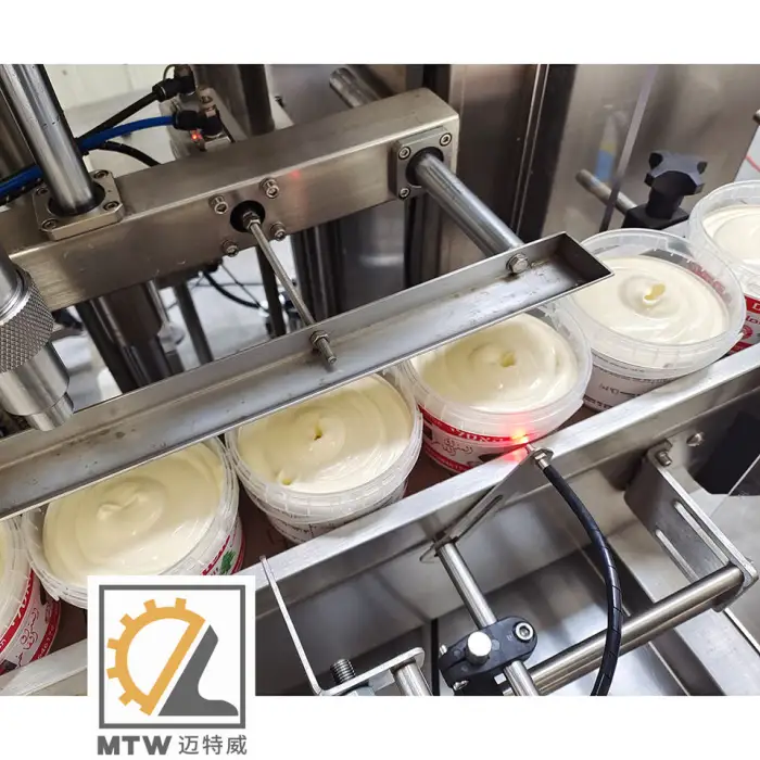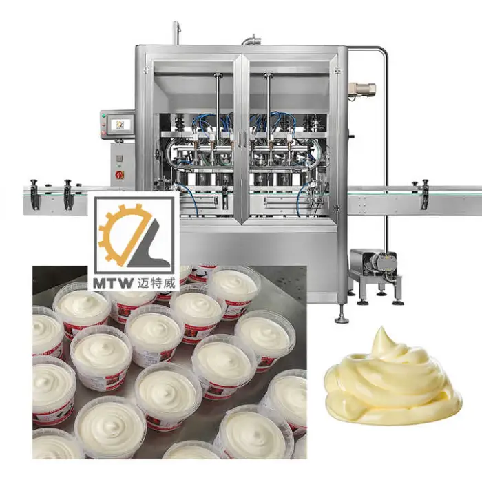 The MTW filling machine is designed to fill a variety of high-viscous products including mayonnaise, cheese, fruit sauces, cream, yogurt, jams, and honey.