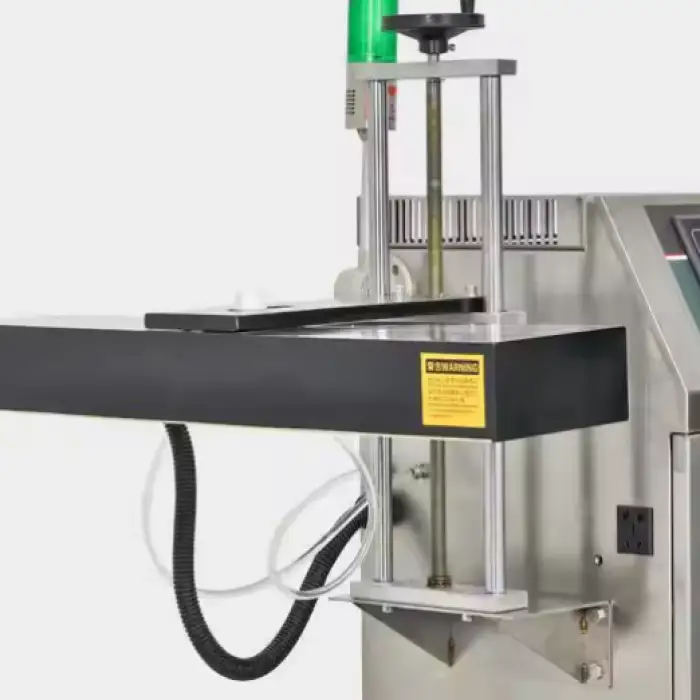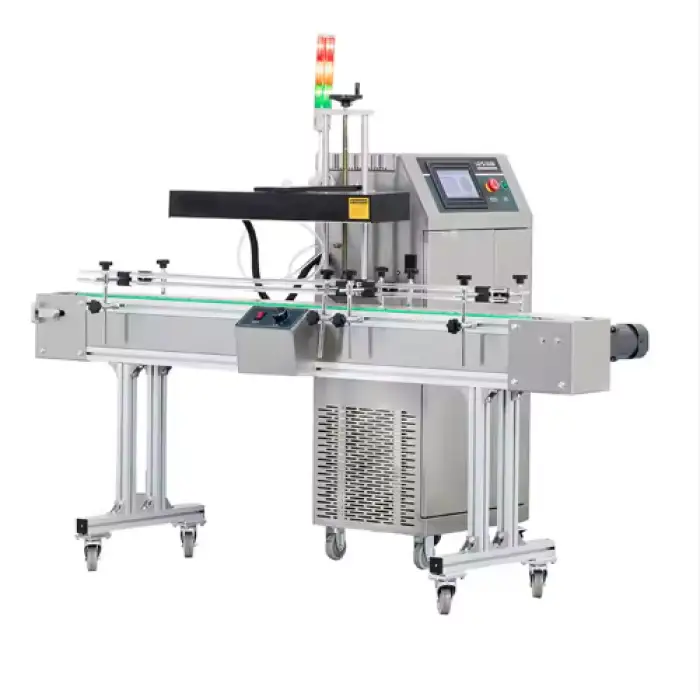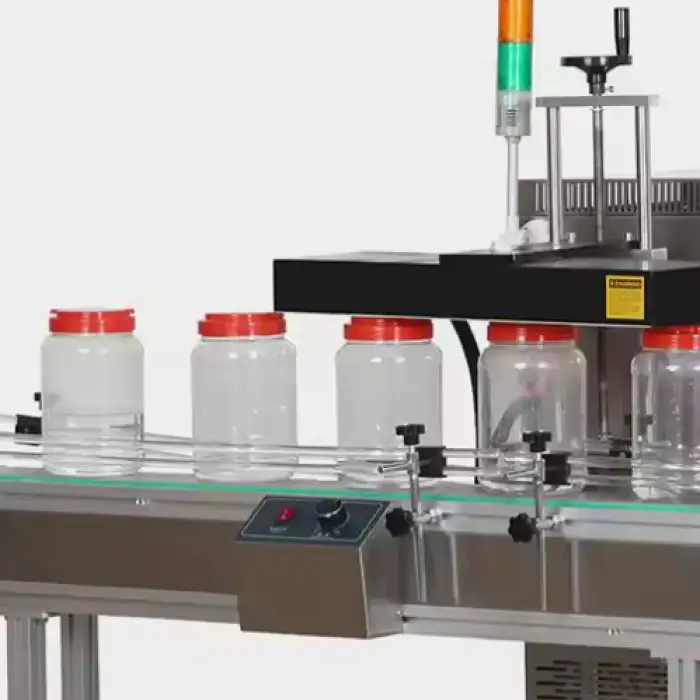 This machine applies an aluminum induction foil liner to plastic, PET and glass bottle openings and seals them hermetically using electromagnetic induction heating with a water-cooled induction head for high-precision, non-contact sealing.