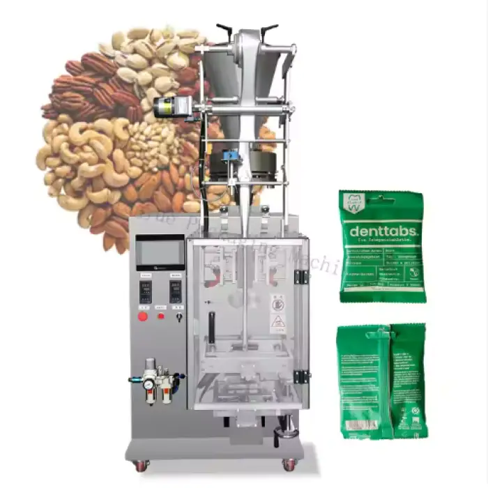 This machine can package products using plastic, paper, film, and foil materials.