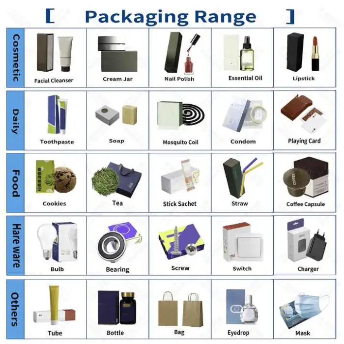 This machine supports multiple packaging types, including cartons, bags, film, belts, pouches, cases, and boxes.