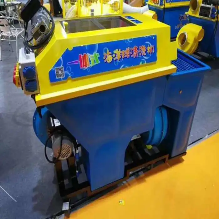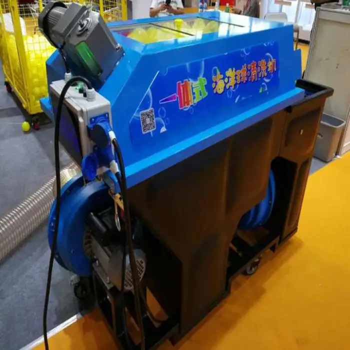 It is a dry-cleaning machine designed to remove dust, crumbs and debris from plastic 'ocean' balls and ball-pit surfaces without using water. Most models combine gentle agitation or brushing with suction/filtration to lift dirt into a collection bin and filter out fine particles, leaving balls clean and dry.
