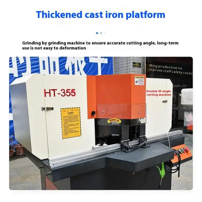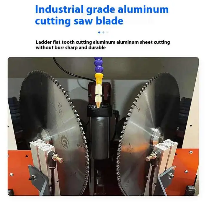 The machine features a double-head design, allowing for precise cutting at 45 degrees, enhancing efficiency and accuracy.