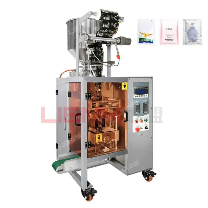 The machine is designed to efficiently pack various liquids including creams, shampoos, lotions, and other liquid products.