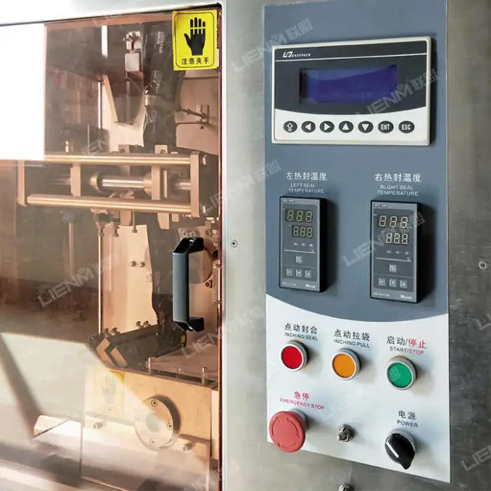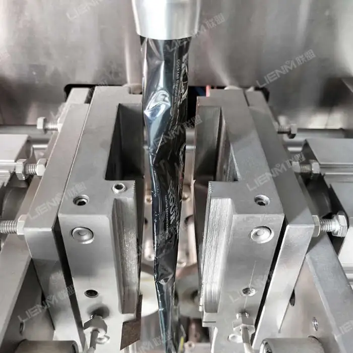 The machine can work with various packing materials including PAPER/PE, PET/AL for PE, and NYLON/PE, as well as tea-leaf filtering paper.