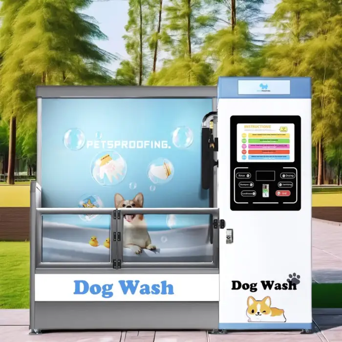 The station features an automatic coin-operated system that allows users to pay for the bathing service, ensuring an easy and convenient experience.