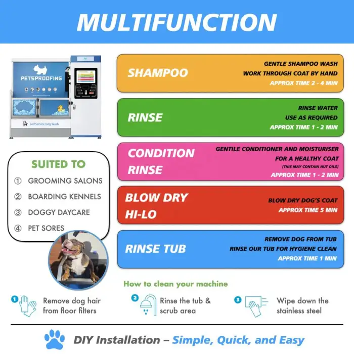 The Novelty Designed Self Service Automatic Coin Operated Large Dog Bathing Station is suitable for dogs, cats, and even small animals, making it versatile for various pet types.