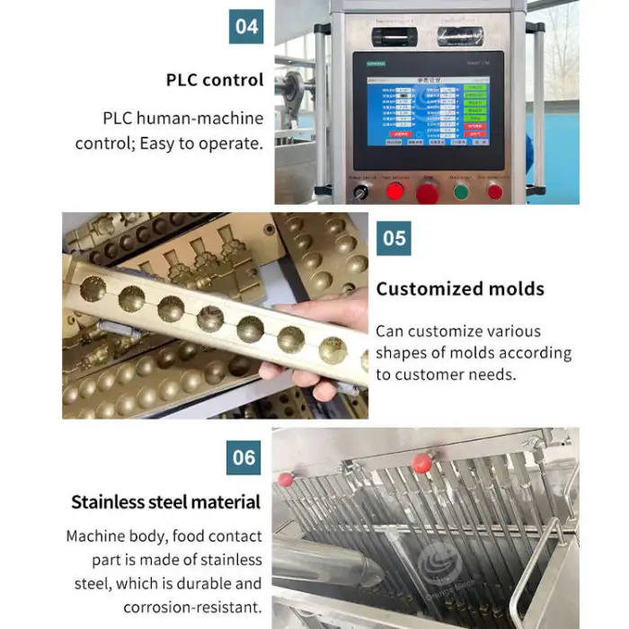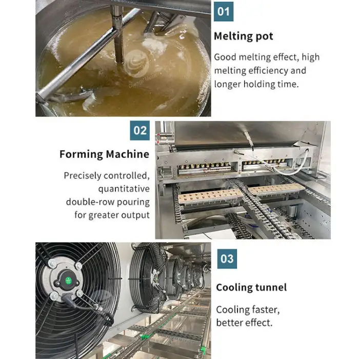The machine is ideal for candy processing in factories, production of gummy bears and jelly beans, retail candy snacks, custom candy designs for events, and large-scale candy distribution.