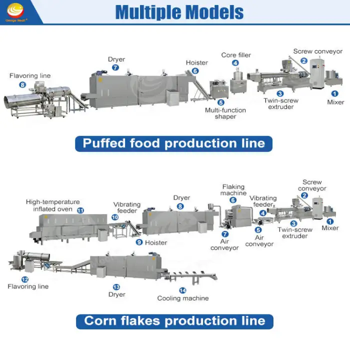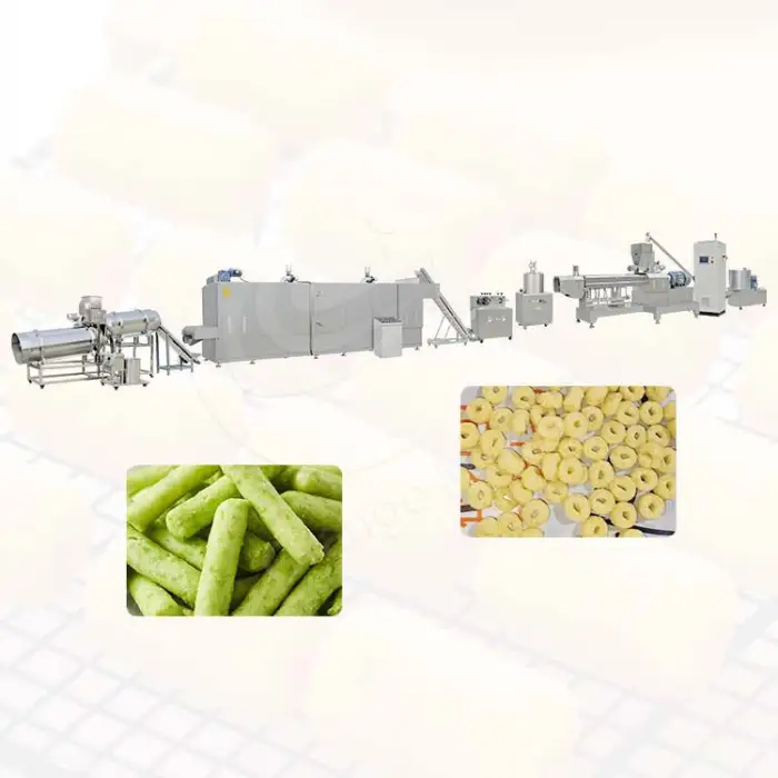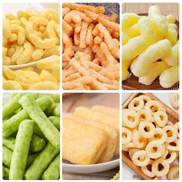 The ORME Snack Manufacture Line is designed to produce various puffed corn snacks, including cheese puffs and custom snack pellets in different shapes.