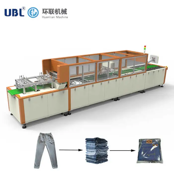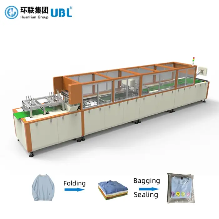 The machine features automatic hot melt sealing or automatic adhesive tape sealing options, ensuring secure packaging of the folded garments.