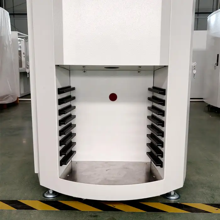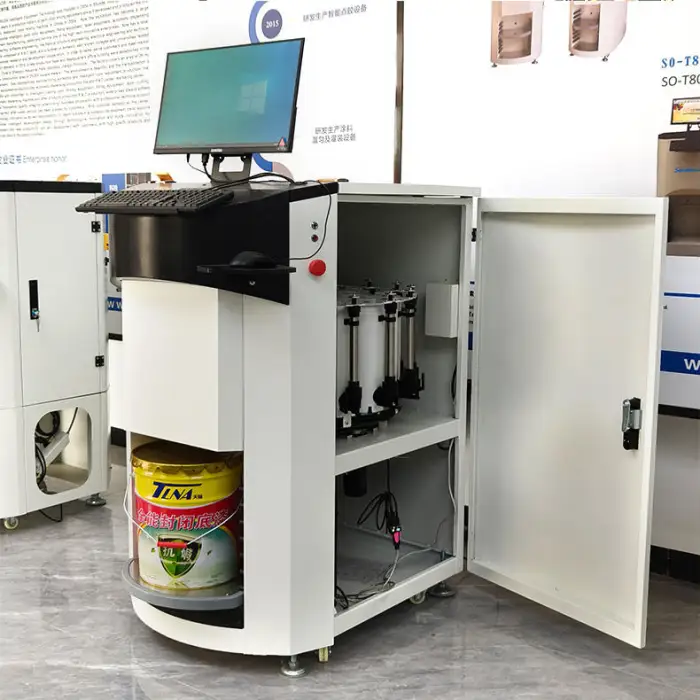 The automatic paint dispenser allows for quick and accurate mixing of paints by measuring and dispensing the exact amount needed.