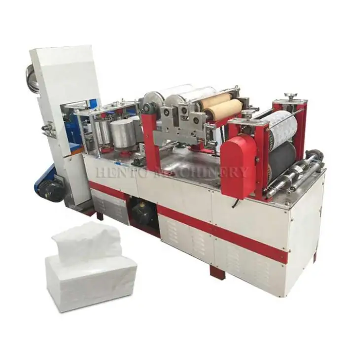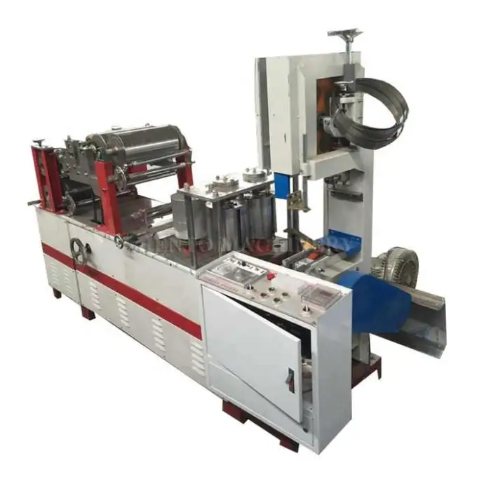 The machine is built for standard tissue paper used for napkins. It handles common tissue types compatible with the specified roll width and core. For nonstandard weights or specialty materials, consult the supplier to verify compatibility or request adjustments.