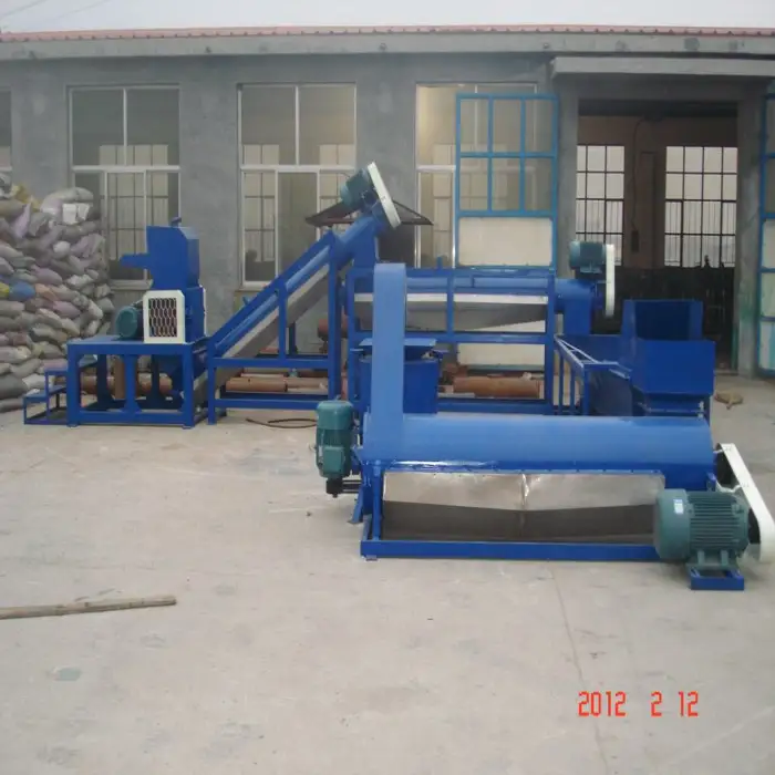 The machine comes with essential components including a dewatering machine, floating washing tank, frication washer, and label remover.