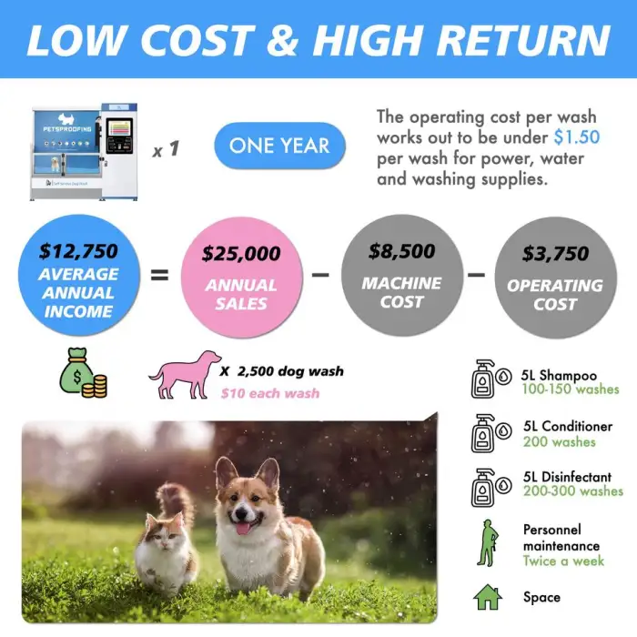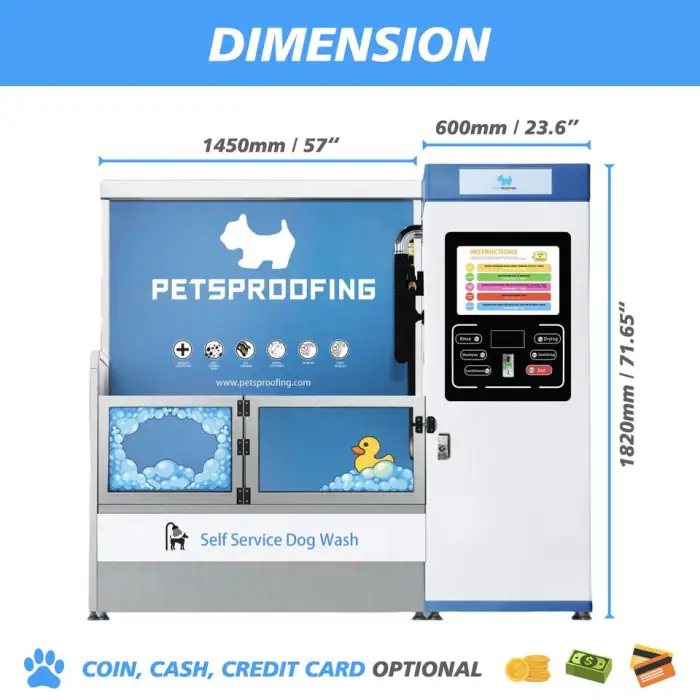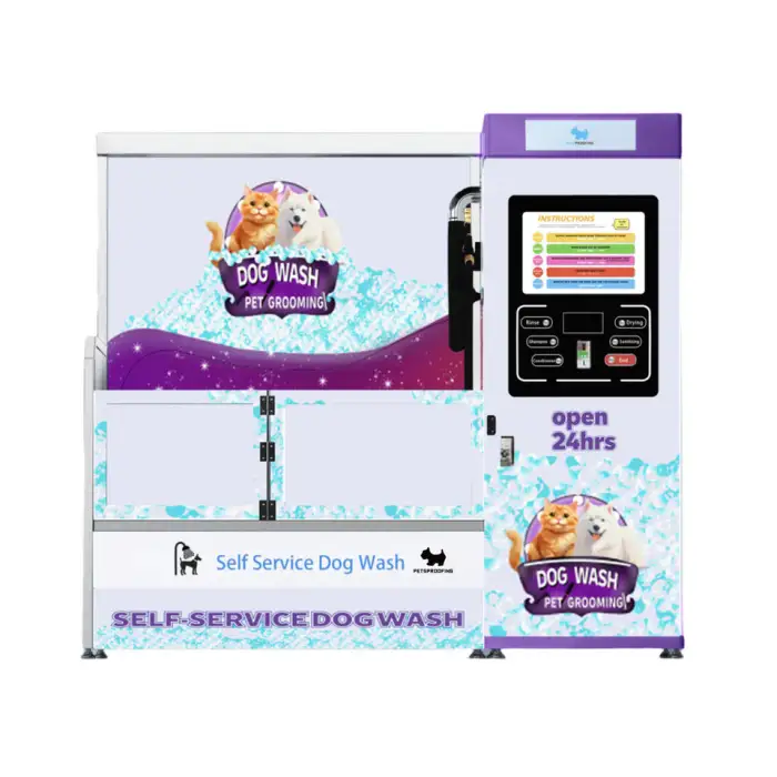 The station is a self-service dog wash that operates on a coin-operated system. Simply insert coins, and the machine provides automatic washing features for your pet.