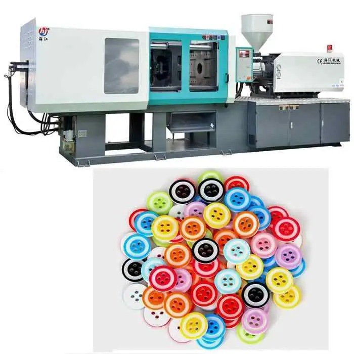 The machine has an injection rate of 275 grams per second, allowing for quick and efficient button production.