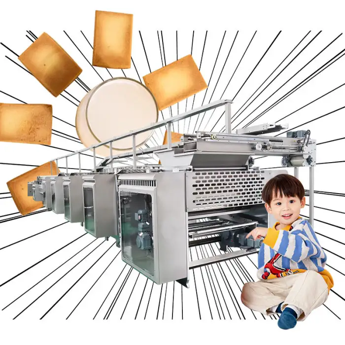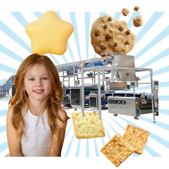 This machine can produce various products including biscuits, wafer biscuits, and cookies.