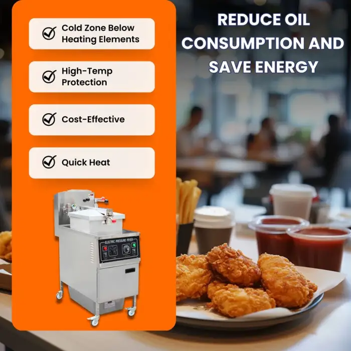 The fryer uses electric heating for even temperature control during frying.
