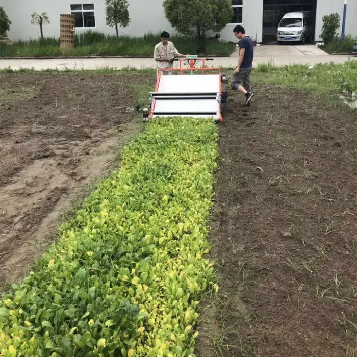 The harvester is designed for a variety of leafy vegetables, including chives, basil, cabbage, spinach, garlic, carrots, tea leaves, corn, wheat, cotton, and root vegetables like peanuts and cassava.