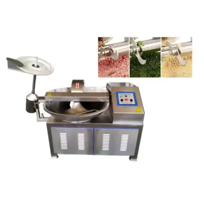 Operate the machine only after training. Always disconnect power before servicing, do not reach into the bowl while running, use provided pushers/tools, wear appropriate PPE, and follow all instructions in the user manual. Confirm local safety standards and any installed interlocks or emergency stops with the supplier.
