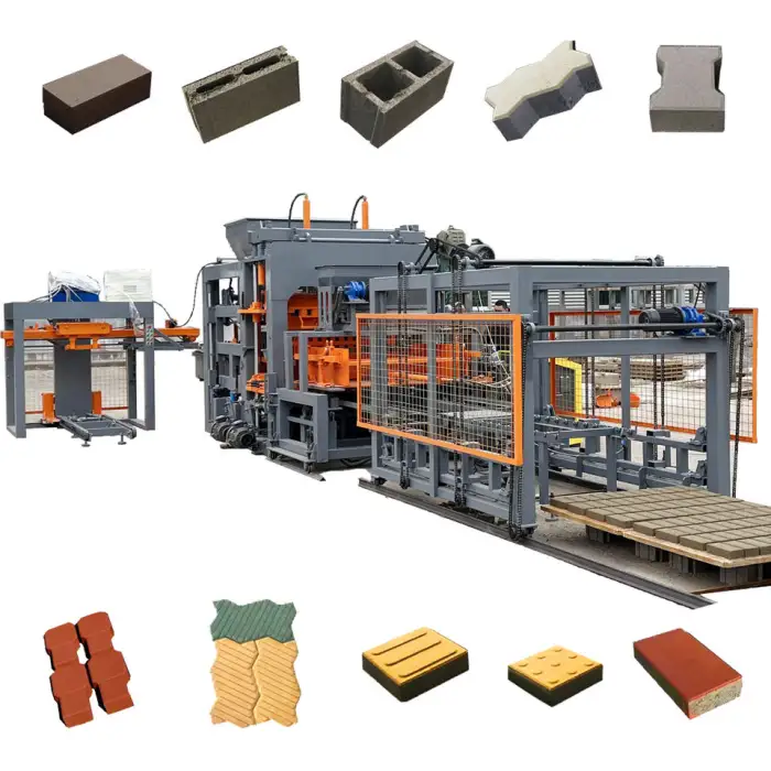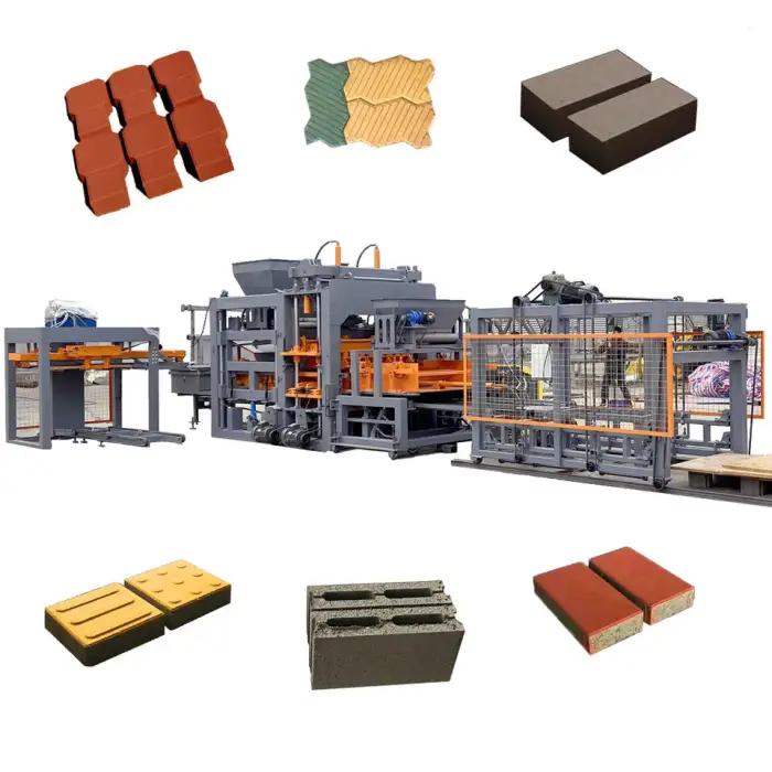 The QT12-15 machine can produce hollow blocks, paver blocks, solid blocks, and interlocking blocks.
