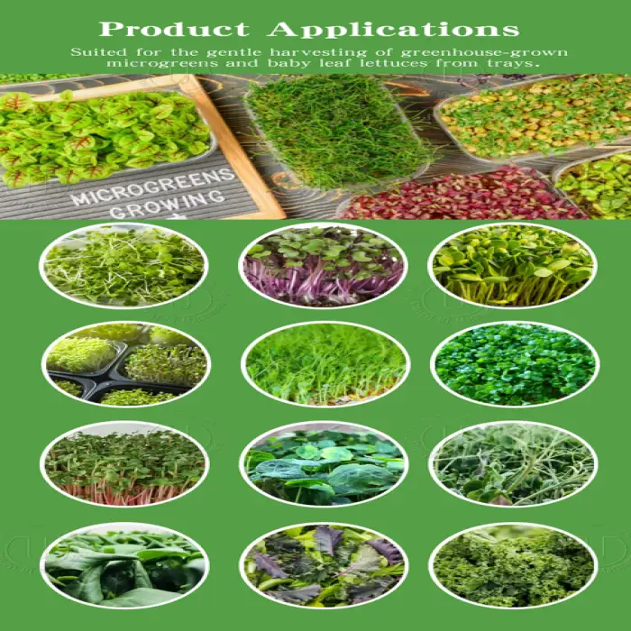 The Quick-Cut Greens Harvester is designed to efficiently harvest sweet peas, shoots, spinach, and other baby leaf lettuces.