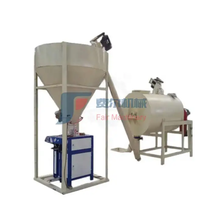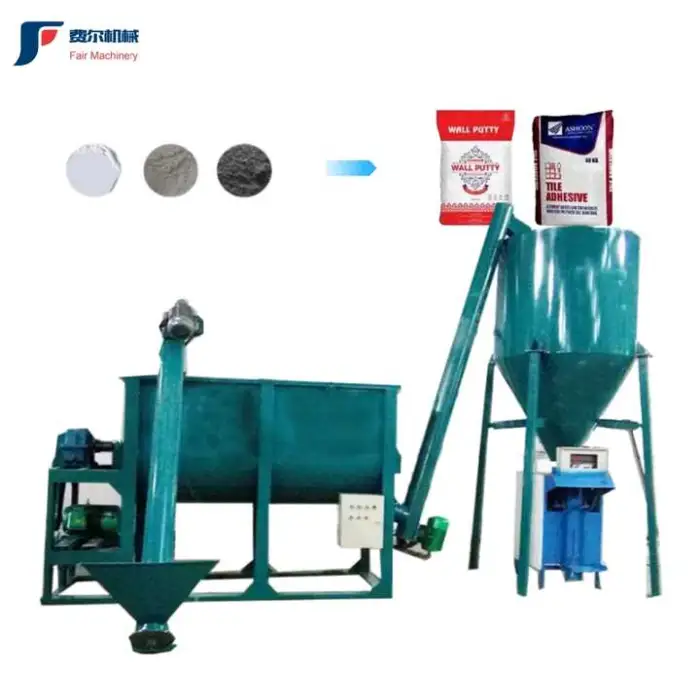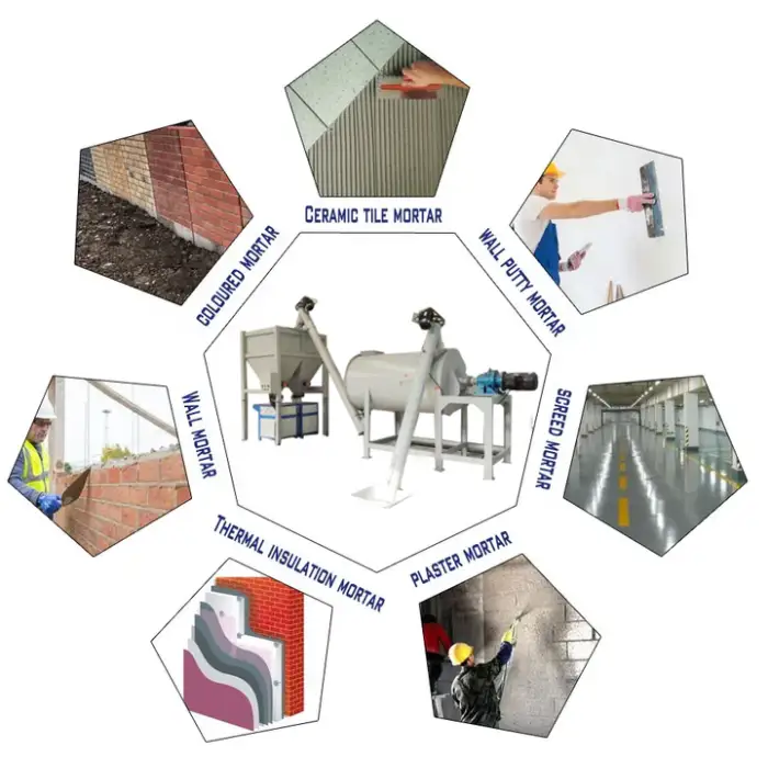 The machine can mix a variety of materials including lime powder, chemicals, cement, and sand, making it suitable for tile adhesive, dry mortar, and wall putty production.