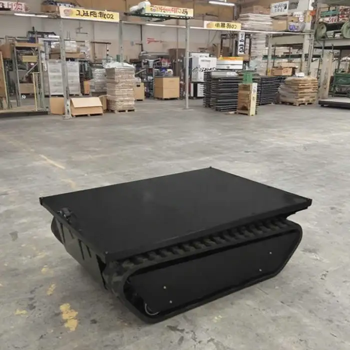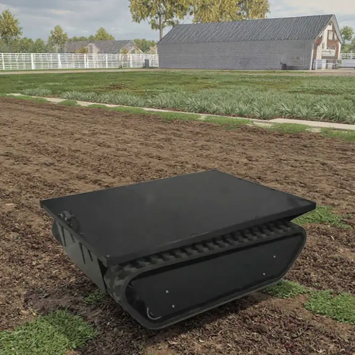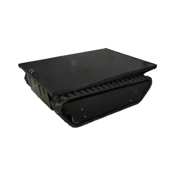The vehicle features sturdy rubber crawler tracks that allow it to move smoothly over various terrains, making it suitable for both rugged and flat surfaces.