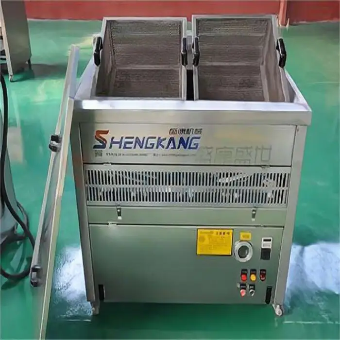 The frying machine is made from food-grade 304 stainless steel, ensuring durability and safety.