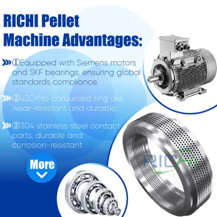 Pellet quality is controlled through proper grinding, accurate mixing, correct conditioning (moisture and temperature control), and the pellet die design. RICHI's design produces dense, uniform pellets when operated with recommended recipes and parameters.