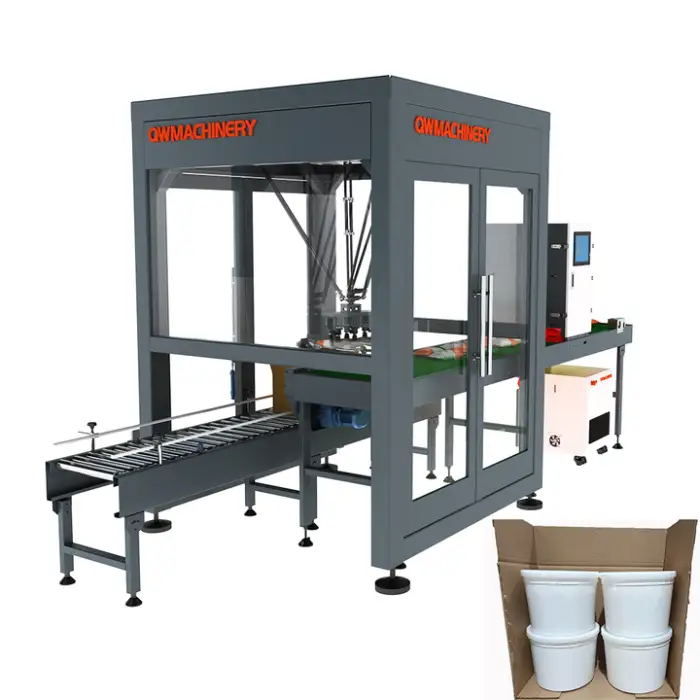 The system is fully automatic with programmable control for robot motion, carton erecting, loading and sealing. HMI interfaces allow recipe storage for different products; advanced PLC/robot controllers are used for reliable operation.