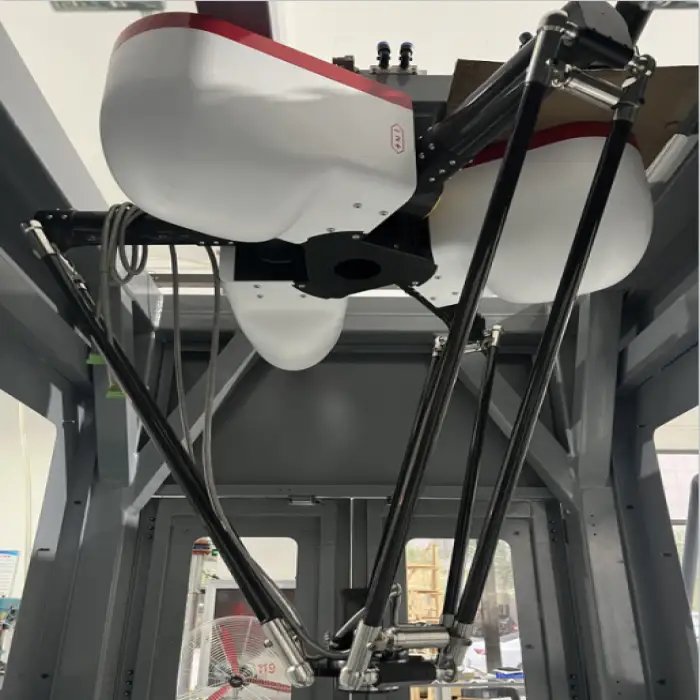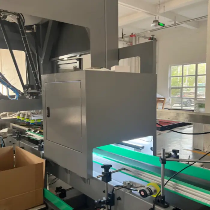 Throughput depends on product size, carton configuration, robot model and line layout. The line is built for high-performance automatic packing; please provide product dimensions and target output so we can recommend a configuration and estimated cans-per-minute rate.