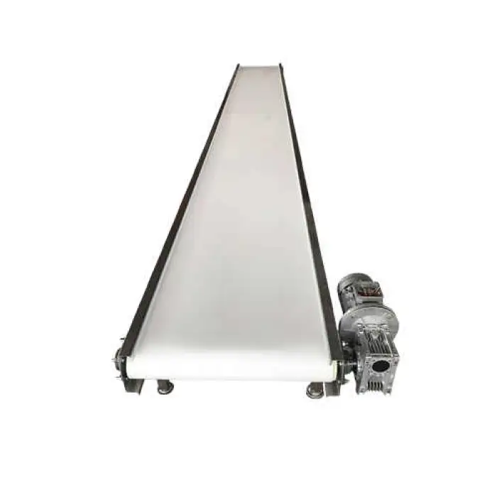 The conveyor is constructed from durable stainless steel, PVC, and PU materials, ensuring longevity and food safety.