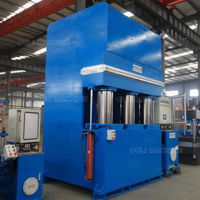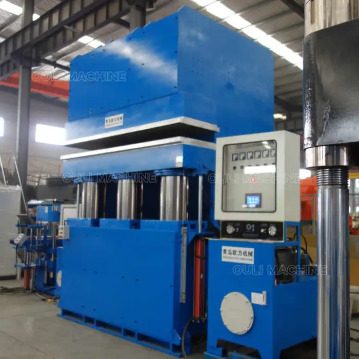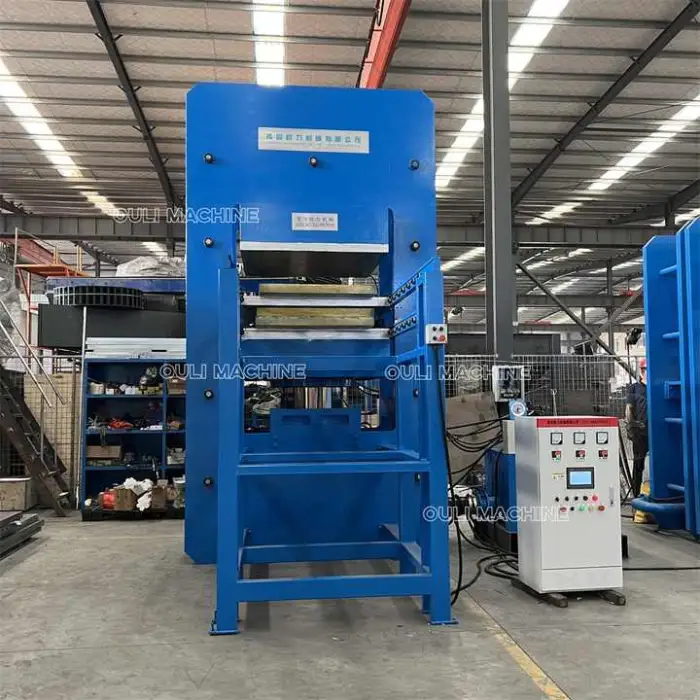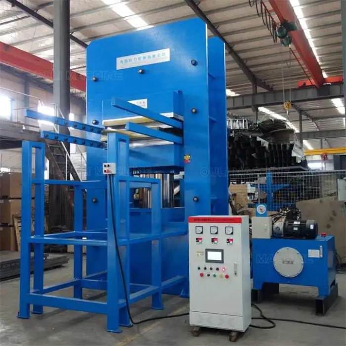The machine features a hydraulic system that ensures powerful pressing during the vulcanization process.