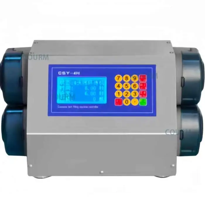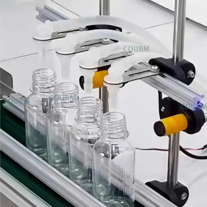 This filling machine features four nozzles for efficient and simultaneous filling.