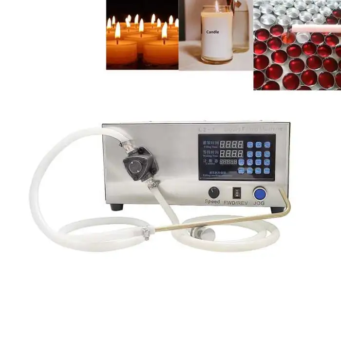 The machine is designed to work with viscous liquids and candle wax, making it suitable for candle making and filling cosmetics.
