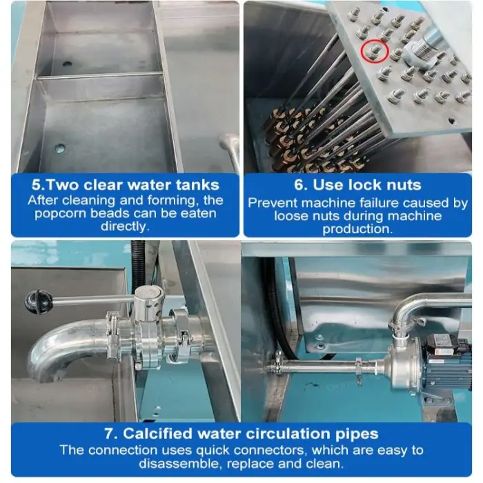 The machine is constructed from durable 304 stainless steel, ensuring longevity and easy maintenance.