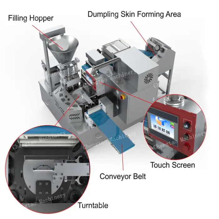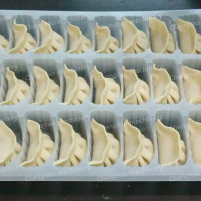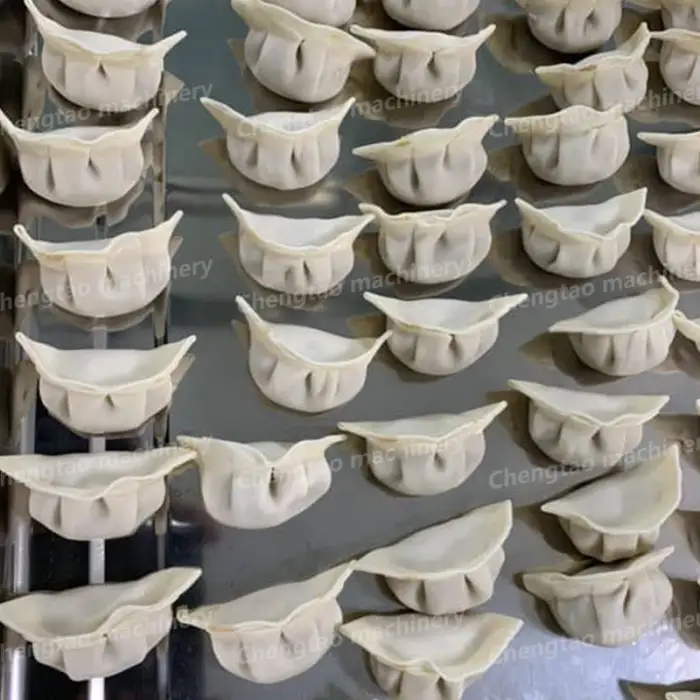 The machine has a production capacity of 6000 to 9000 gyoza per hour, making it ideal for high-volume food production.