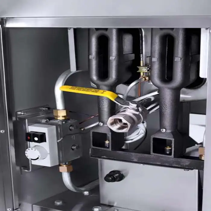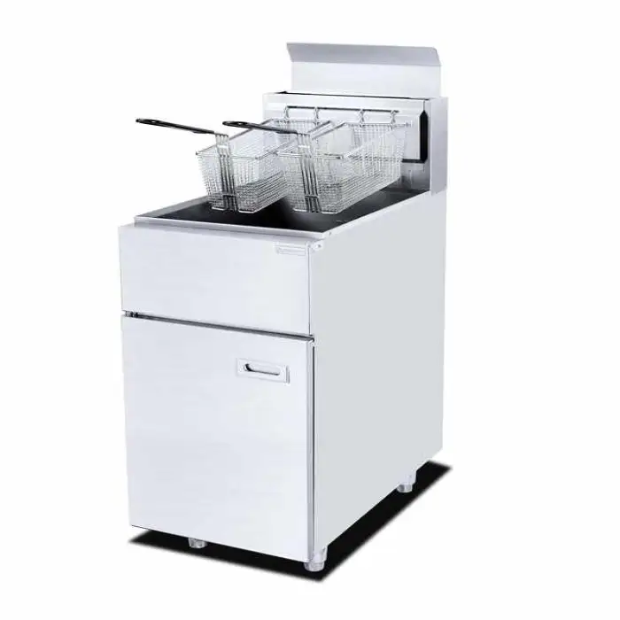 The fryer operates on gas, providing efficient heating for frying.